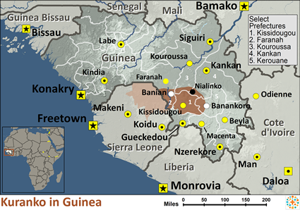 The Kuranko occupy a mountainous region within the northeastern Sierra Leone highlands, extending into Guinea. This region lacks adequate road systems and is not easily accessible, leaving the Kuranko socially isolated. This may explain why most have held on to their traditional culture and religion.