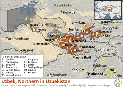 Pray for the families and communities in this large people group to discover and embrace the truth about the prophet Isa (Jesus), about whom the Koran teaches, and whom the Bible reveals in fullness.Pray the Uzbeks would understand that Jesus desires to bless their families and neighborhoods.Pray that believers among the Uzbeks would be effective at engaging their families and communities in discussing Bible stories and experiencing God's blessing.Many younger Uzbeks are looking for a belief system to satisfy their deepest spiritual hunger. Pray for workers to sow God's word into Uzbek families, healing and strengthening households with God's blessing.