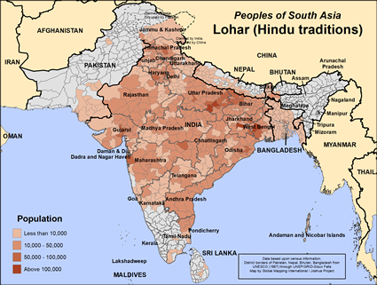 Lohar people of India are nomadic smiths who travel in to sell their goods. They are descendants of high-caste weapon makers of the Mewar Kingdom in India. Unfortunately, they became poor nomads when the kingdom fell in 1568, and they remain poor today. Although they are nomads, most Lohar people live in the Indian state of Uttar Pradesh.