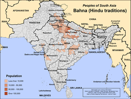 The Bahna or Behana are a Hindu people who live in north and central India. Their name comes a word for "seed." Their traditional occupation was separating the seeds from raw cotton. The Bahna believe they originally came from Persia or Afghanistan. The Bahna are a Scheduled Caste meaning they receive special consideration for public jobs and university admissions. The primary language of the Bahna is Hindi. The large majority of the Hindu Bahna live in the Indian state of Uttar Pradesh. Some Bahna became Muslims during the time of the Moghuls. Many of them left India and moved to Pakistan in 1947.